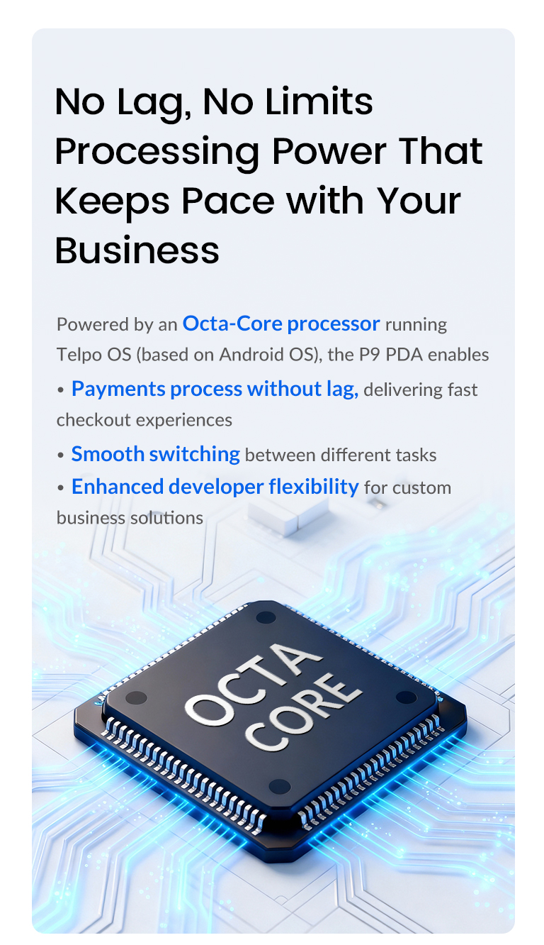 Powered by an Octa-Core processor running Telpo OS (based on Android OS), the P9 PDA enables