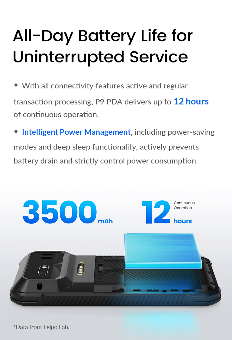 - With all connectivity features active and regular transaction processing, P9 PDA delivers up to 12 hours of continuous operation.
